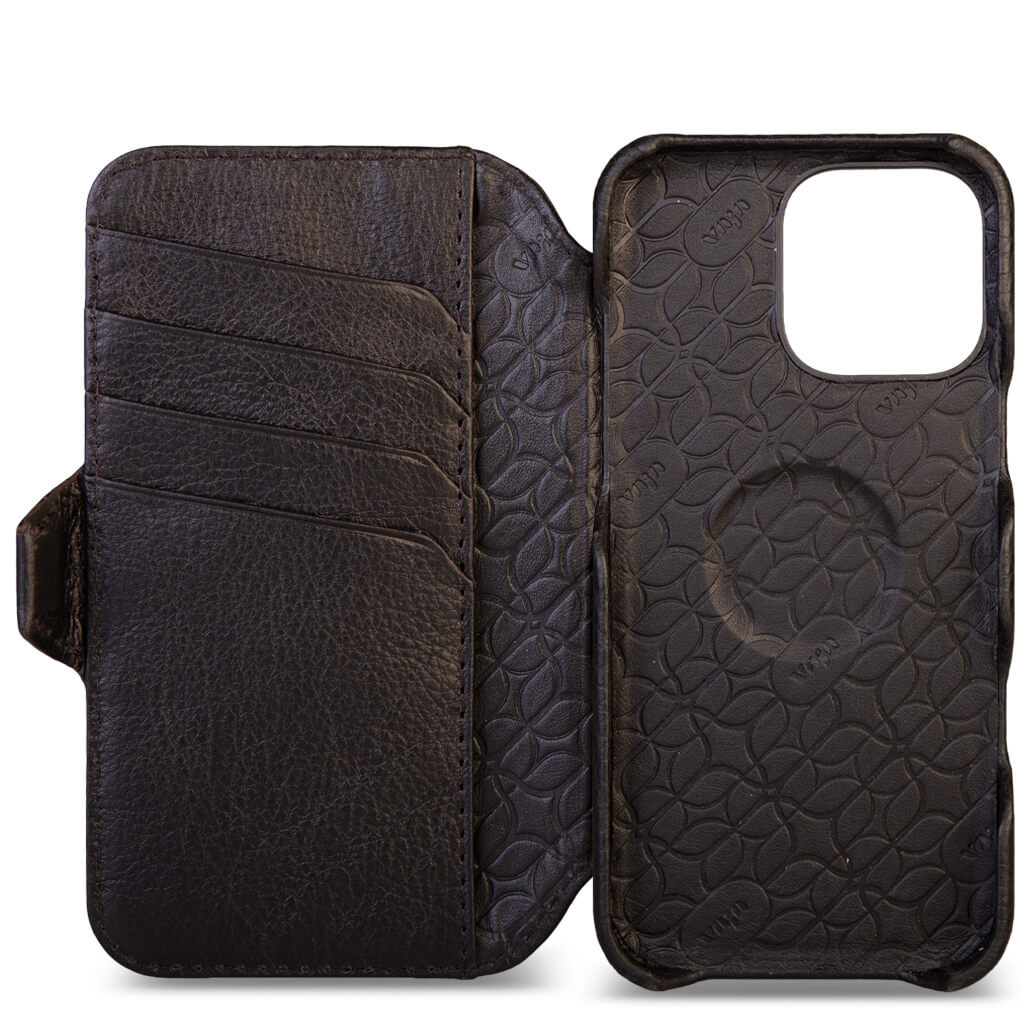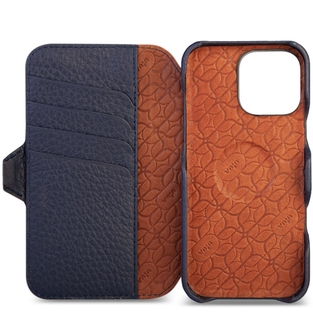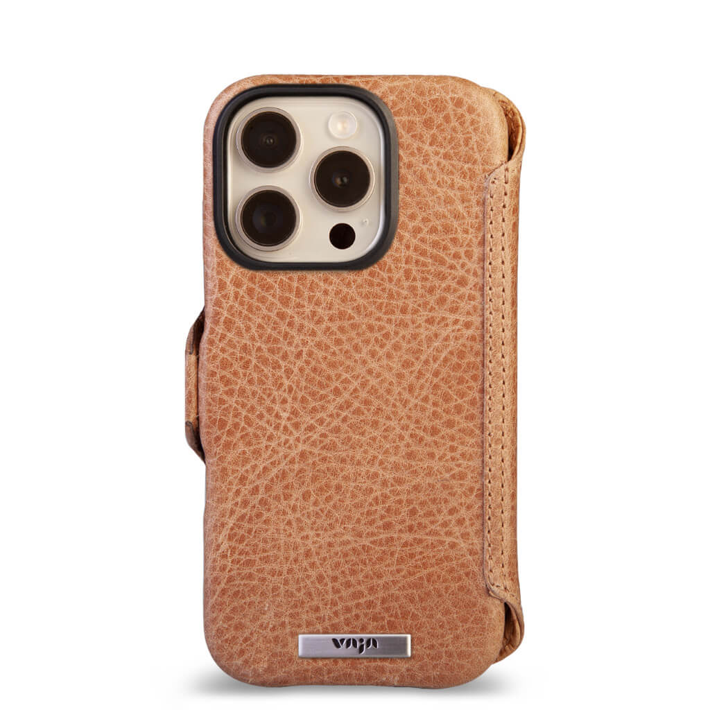 Timeless and our enduring favorite, the iPhone 16 Pro wallet leather case has built-in rare earth magnets and is fully compatible with Magsafe accessories plus provides exceptional screen protection, space for 5 cards with RFID shielding, and a compartment for folded bills. Designed with strong magnets for effortless use with V-Mag add-on accessories, each case is handcrafted with artisanal techniques and premium Patagonia leathers in our Buenos Aires workshop, to build this case we use 40 different pieces, in a process that involves 6 craftsmen, 7 days and around 70 steps to complete. Our leather artisans prioritize quality over mass production. For enhanced security, the wallet case includes a new stronger N52 magnetic closure. Select from our curated in-stock options or design a custom piece that mirrors your unique style.