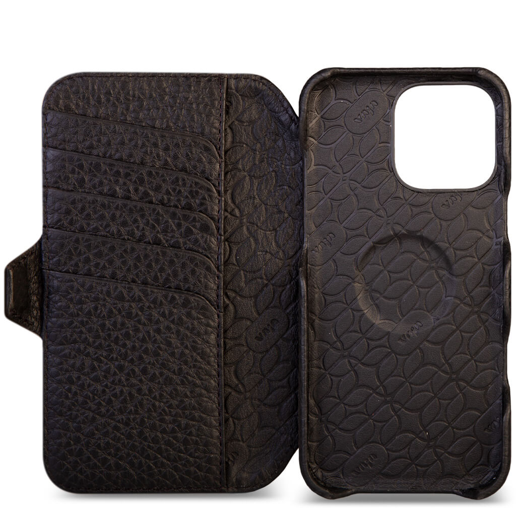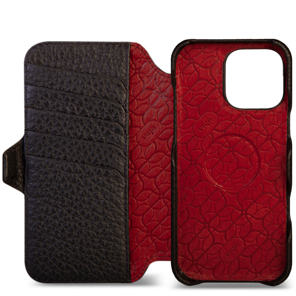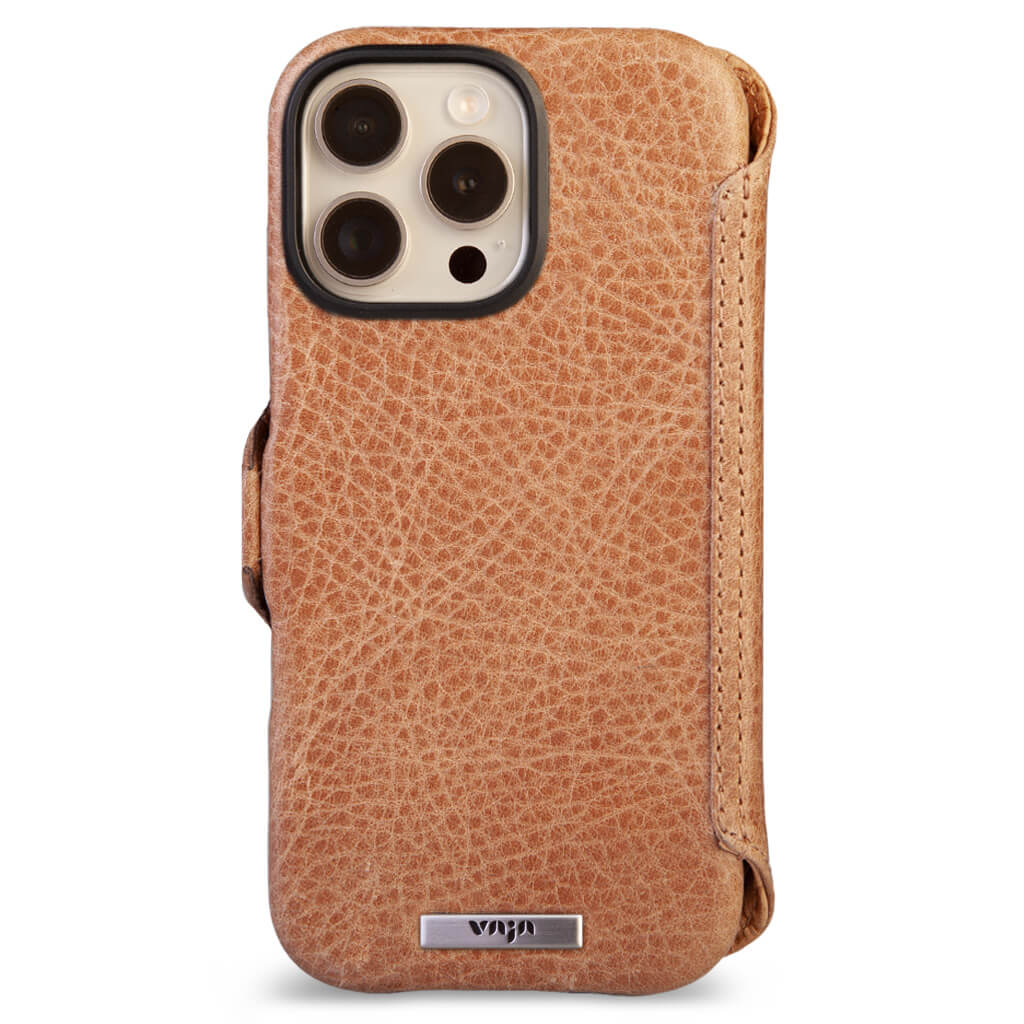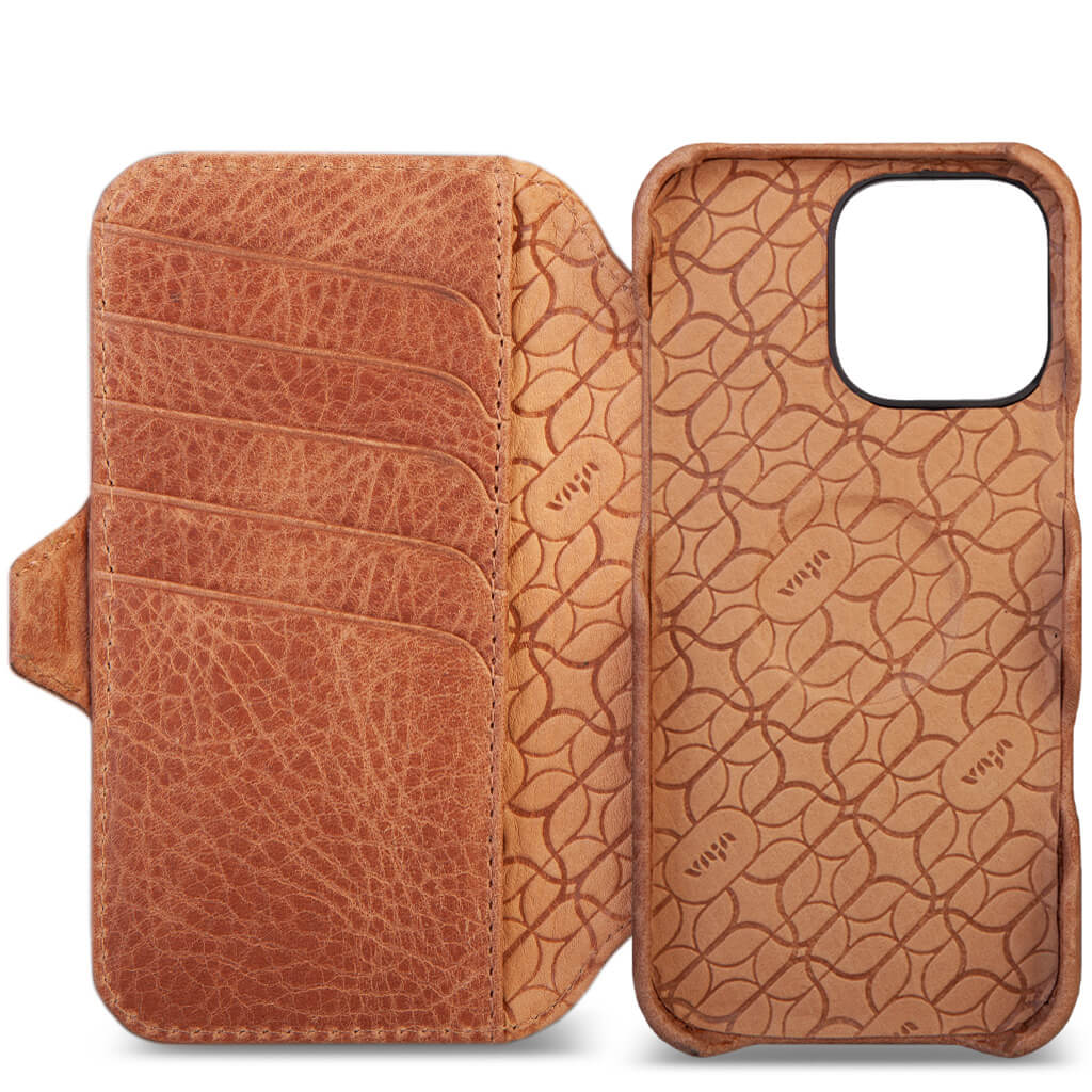 Historically beautiful and our long-time best seller, this iPhone 16 Pro Max wallet leather case offers unmatched screen protection, storage for 5 cards with RFID protection, and a discreet compartment for folded bills. Crafted with strong N52 rare earth magnets for seamless interaction with V-Mag accessories, each case is made using artisanal techniques and the finest Patagonia leathers in our Argentina workshop. For added safety, the wallet case features built-in magnets and is fully compatible with Magsafe accessories plus a new stronger magnetic closure that wont interfere with the Compass app.